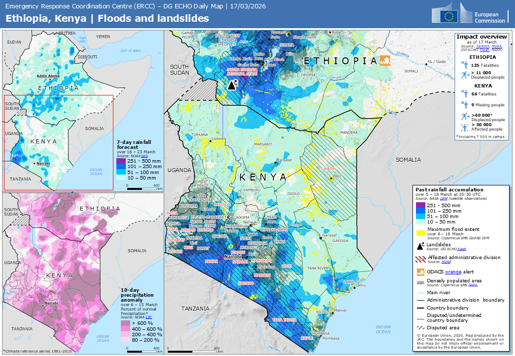 Map of disaster alerts in the past 4 days. European Union, 2026. Map produced by EC-JRC.The designations employed and the presentation of material on the map do not imply the expression of any opinion whatsoever on the part of the European Union concerning the legal status of any country, territory or area or of its authorities, or concerning the delimitation of its frontiers or boundaries.